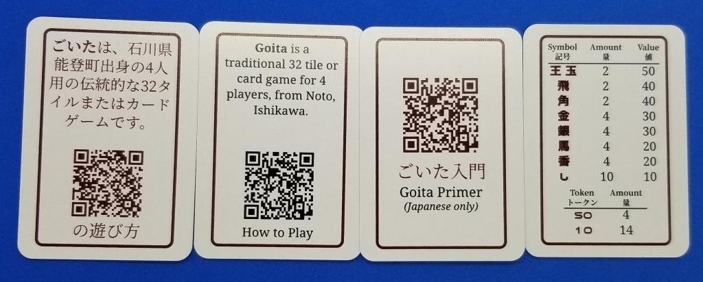 These will be distinguishable from future versions for a few reasons. First, the MPC cards a little wider than I had formatted, so the left-right margins are a little more open. Second, after ordering the cards, I realized the backs are 2-way (look the same no matter which way turned), but the fronts are 1-way. So I’m still tinkering with the back. I also need to work on the information cards, especially the card list, as the card marks are a little heavy and harder to read. The QR codes might get a little adjustment, possible replacing the square registration targets for the traditional Goita token shape.